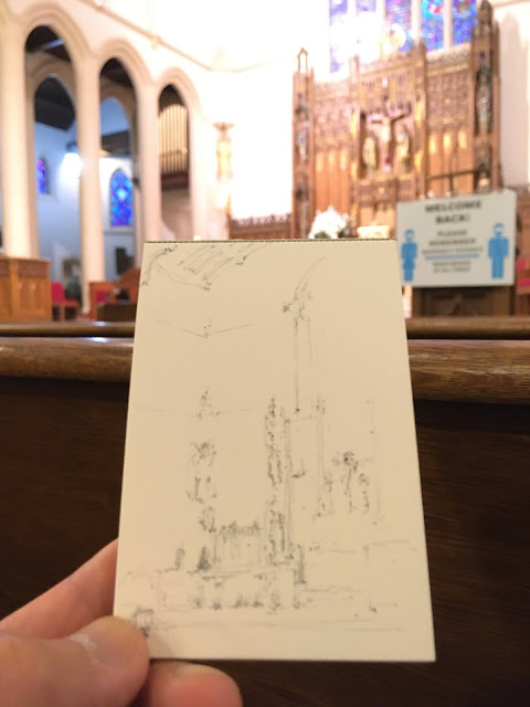 I attended the eight o'clock morning mass last Thursday at the Church of the Resurrection in Rye, NY. That was my first mass attendance since the pandemic began last year. I arrived a bit earlier so I sketched the altar. Once the service was over, I added a little bit more details..